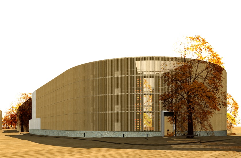 Vor dem Eingang zum neuen Wohnhaus entsteht ein Platz mit einem neu zu pflanzendem Baum. Dieser Platz ermöglicht es beim Ankommen und Verlassen des Hauses genügend Abstand vom Durchgangsverkehr zu haben. Er ist auch als vorgelagerter Puffer zur ruhigen Wohnwelt hinter der Tür zu sehen. Während der Siegmundsgraben süd-westlich des Grundstücks als stark befahrene Stadtstraße für die zukünftigen Bewohner ist von geringer Attraktion ist, öffnet sich nach Nord-Westen mit der Saale und ihren parkähnlichen Ufern und Uferwegen eine qualitativ wertvolle Landschaft für das Wohnprojekt. So ist es das erste Ziel gewesen, die wesentlichen Funktionen, die Aufenthaltsräume, Freisitze und Gärten zur Saalelandschaft hin zu orientieren und gleichzeitig Distanz zur verkehrsreichen Straße zu schaffen. Die Funktionen des Gebäudes werden vom Straßenraum hin zur Gartenlandschaft geschichtet. Diese Schichtung funktioniert in zweierlei Hinsicht wie ein Filter. Zum einen wird der Verkehrslärm und das hektische Treiben der Straße bereits mit der ersten Schicht, der Lamellen-Fassade, zum Laubengang hin abgemildert, ohne den Stadtraum jedoch völlig auszuschließen. Zum anderen ist der Laubengang nicht mehr öffentlicher Straßenraum, denn der Zugang ist nur für Bewohner und Gäste offen. Es entsteht eine halböffentliche Zone welche Ein- und Durchblicke durch die offene Lamellenstruktur erlaubt. Bewegungen vor und hinter der ersten Haut sind sichtbar und doch geschützt. Die zweite Schicht ist die eigentliche Fassade zu den Wohnungen hin. Sie dient dem Schutz der Privatsphäre und dem Aussperren der Straßenumwelt sowie als Klimaschutz. An dieser Fassadenseite befinden sich vornehmlich funktionale Räume, wie Dielen, Küchen und Bäder. Dem Eingang vorgelagert ist jedoch noch ein halbprivater Bereich, der wie ein Vorplatz den Übergang vom öffentlichen Raum zur Privatsphäre fließend gestaltet. Dieser Bereich soll auch zu einer höheren Identifikation mit dem Haus und der eigenen Wohnung dienen. Hier gibt es Platz für Pflanzungen, einer Sitzgelegenheit und genug Standfläche für individuellen und persönlichen Dinge. Nach der funktionalen Schicht der Fassade und der Nebenräume kommen die Aufenthaltsräume mit Ausrichtung zum Garten und zur Saale. Der Lärm und die Öffentlichkeit sind hier jetzt ausgesperrt. Die Aufenthaltsräume werden von den privaten Terrassen und Balkonen zum halböffentlichen Park getrennt. Dieser Park steht den Bewohnern und Ihren Gästen als Erholungsort zur Verfügung. Alle Wohnungen öffnen sich mit großen verglasten Flächen hin zum Garten. Die Wohnungen werden über den Laubengang erschlossen und sind barrierefrei. Ein Aufzug erschließt die Laubengänge in vertikaler Richtung. Der große nicht überdachte Wohnhof dient zur Verteilung im Haus aber auch als Treffpunkt und Ort der Kommunikation, gleich den traditionellen Wohnhöfen in Spanien und Italien. Hier gibt es auch Stellflächen für Kinderwägen und Gehhilfen. Die bunt schimmernden runden Fenster zum Wohnhof sollen den heiteren Charakter der Anlage unterstützen und eine Verbindung zwischen dem Garten und der Eingangshalle schaffen. Entlang der Rampen befinden sich bepflanzbare Beete. Gewerbeeinheit und Gemeinschaftsräume Die Büros des Bund Naturschutz und die Gemeinschaftsräume können über den Haupteingang und den Gartenweg erschlossen werden, direkt von der Garage aus über die Treppe oder barrierefrei über den Laubengang. Der Gemeinschaftssaal gibt den Blick frei auf die gemeinschaftliche Grünanlage und einen Vorplatz. Die Glasfront könnte im Sommer auch geöffnet werden. Eine Trennung der Gewerbeeinheit von den Gemeinschaftsräumen ist möglich. Die Garage bietet Platz für 26 Fahrzeuge inklusive vier rollstuhlgerechter Parkplätze, Fahrradstellplätze, die Mieterkeller und den Müllraum sowie der Technik und einen Hauswirtschaftsraum. Vor der Einfahrt in die Garage befinden sich noch weitere sechs Stellplätze.